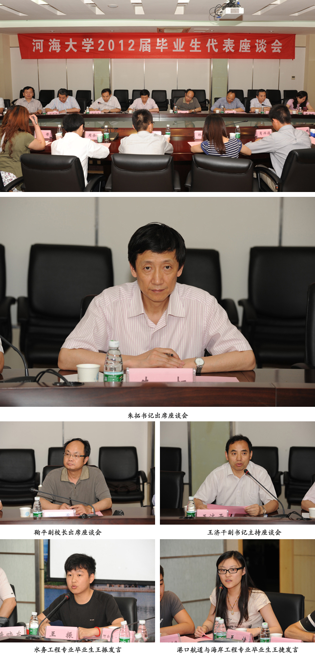 6月7日,河海大学举行2012届毕业生代表座谈会。校党委书记朱拓、副校长鞠平、党委副书记王济干出席座谈会。座谈会由王济干副书记主持。学校各有关部门负责人参加了会议。