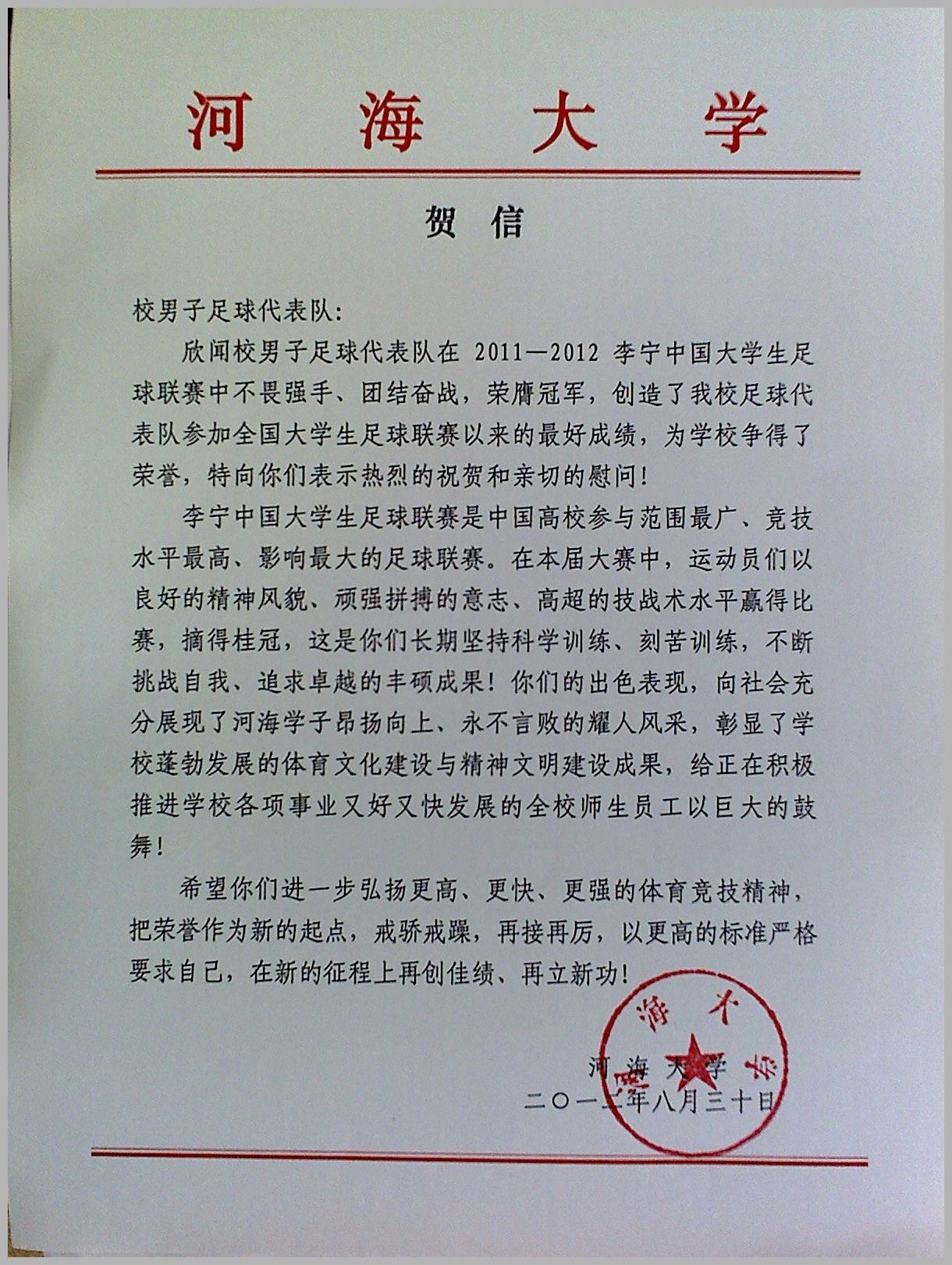 欣闻校男子足球代表队在2011—2012李宁中国大学生足球联赛中不畏强手、团结奋战,荣膺冠军,创造了我校足球代表队参加全国大学生足球联赛以来的最好成绩,为学校争得了荣誉,特向你们表示热烈的祝贺和亲切的慰问!