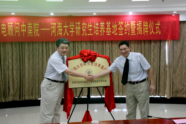 近日,河海大学与中国水电顾问集团中南勘测设计研究院共建研究生培养基地签约暨揭牌仪式在长沙举行,河海大学校长、研究生院院长王乘和中南院院长冯树荣共同为研究生培养基地揭牌;河海大学副校长朱跃龙和中南院副院长罗俊军共同签署研究生培养基地协议。