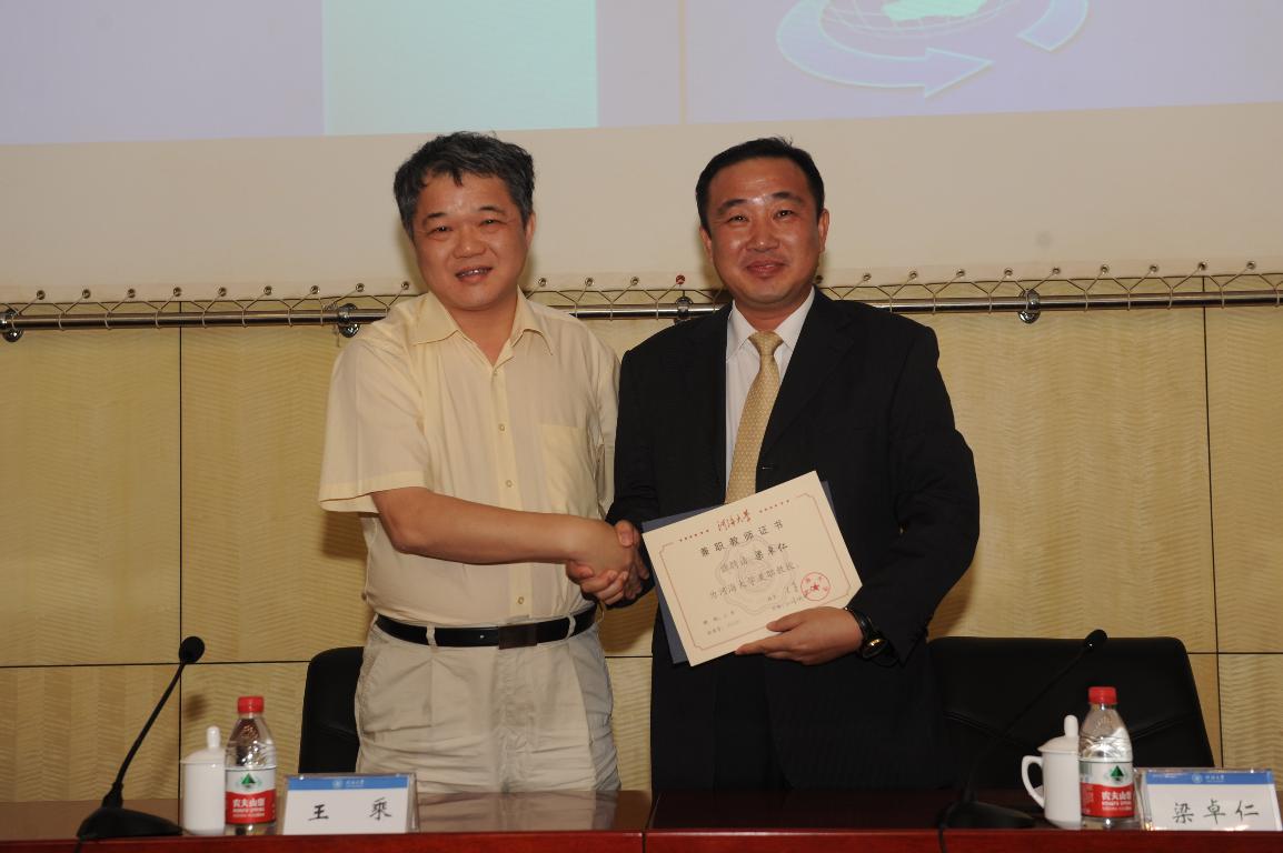 王乘校长(左一)为梁卓仁董事长(左二)颁发聘书