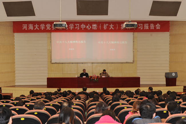 11月28日,河海大学举行党委理论学习中心组(扩大)集体学习报告会。学校特邀十八大代表、南京大学党委书记洪银兴教授就认真学习贯彻党的十八大精神作了宣讲报告,报告会由校党委书记朱拓主持。