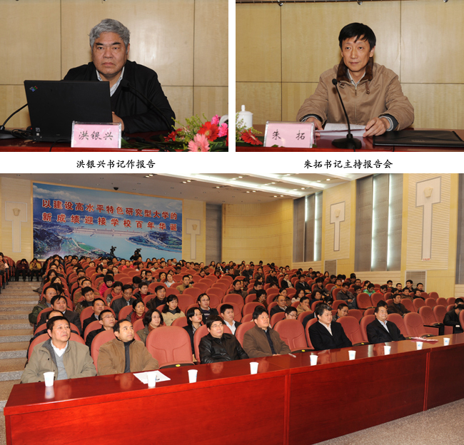 洪银兴书记传达了党的十八大会议的总体情况、十八大报告的主要内容、修改党章的有关情况以及胡锦涛同志在江苏代表团的重要讲话和活动,并对十八大报告的主要内容进行了重点阐述,详细解读了十八大的新思想、新观点、新要求。洪银兴书记以自己独特的视角、理性的思辨、深切的感悟、睿智的认识,畅谈了他对中国特色社会道路、中国特色社会主义理论体系和中国特色社会主义制度的理解,以及对报告提出的作为我们发展中国特色社会主义共同信念的“八个坚持”、基本国情及党和国家的奋斗目标的深刻认识,并对经济建设、政治建设、社会建设、文化建设、生态文明建设和党的建设做了详细的阐述,尤其对十八大报告中教育的阐述进行了全面分析,分享了自己的深刻感悟。洪银兴书记强调,我们要高举中国特色社会主义伟大旗帜,紧密团结在习近平为总书记的党中央周围,为全面建成小康社会而奋斗,不断夺取中国特色社会主义新胜利,共同创造中国人民和中华民族更加幸福美好的未来。
