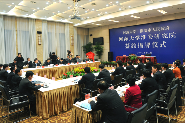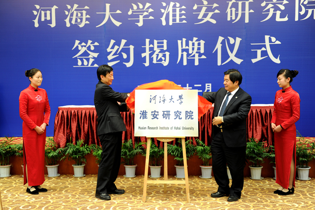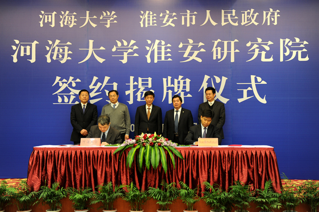 河海大学淮安研究院签约暨揭牌仪式12月14日在淮安市举行。河海大学党委书记朱拓、淮安市委书记刘永忠为“河海大学淮安研究院”揭牌,河海大学校长王乘、淮安市市长曲福田签署《河海大学--淮安市人民政府共建河海大学淮安研究院合作协议》。淮安市副市长陈涛主持仪式。
