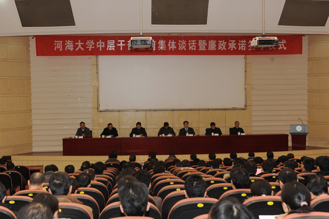 1月17日,河海大学中层干部换届工作圆满结束,学校举行中层干部任前集体谈话暨廉政承诺书签字仪式,校领导和全体中层干部参加仪式。校党委书记朱拓作了题为《学习贯彻十八大精神,建设高素质干部队伍》的讲话,校长王乘作了题为《开拓新思路,实现新突破,不断开创学校科学发展新局面》的讲话,校党委副书记兼纪委书记陈德奎作了集体廉政讲话,全体中层干部签订了廉政承诺书。仪式由校党委副书记王济干主持。