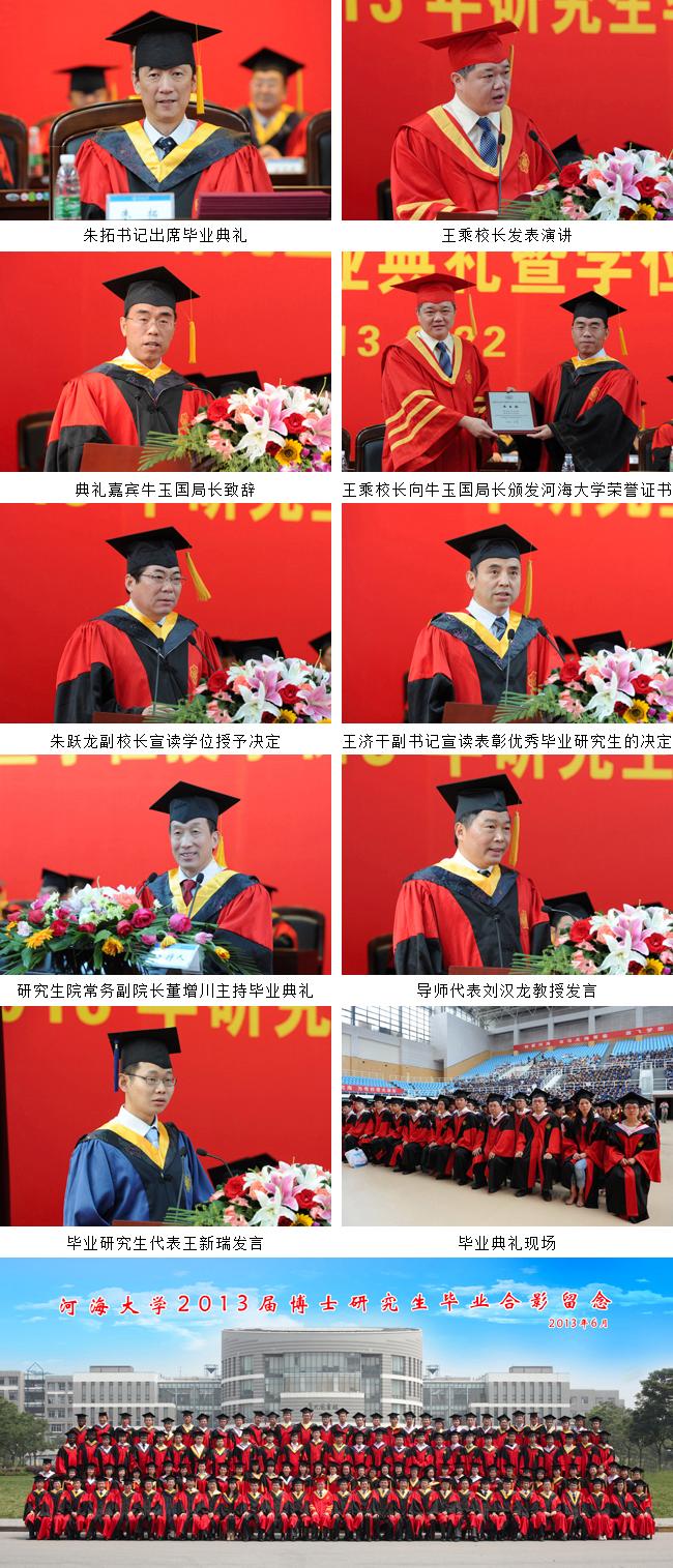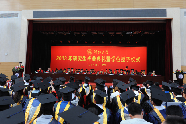 毕业典礼上,校长王乘向典礼嘉宾牛玉国校友颁发河海大学荣誉证书。副校长朱跃龙宣读了《河海大学学位评定委员会十一届一次会议关于授予博士、硕士、专业学位的决定》,校党委副书记王济干宣读了《关于表彰河海大学2013届优秀毕业研究生的决定》。最后,在庄严隆重的乐曲声中,校领导、嘉宾及导师代表为获得博士、硕士学位的同学扶正流苏并颁发学位证书。毕业典礼暨学位授予仪式后,校领导、嘉宾、研究生院领导、各学院领导与毕业研究生合影留念。