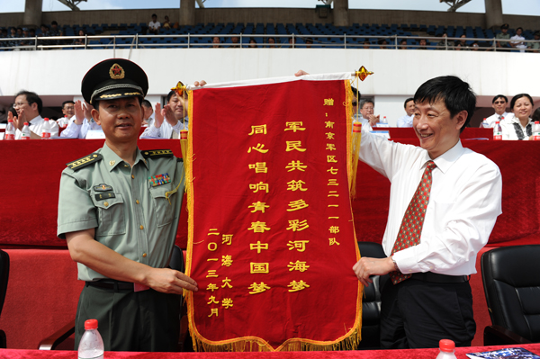 大会在庄严的国歌声中开始。校党委书记朱拓向承训部队舟桥旅赠送了锦旗。