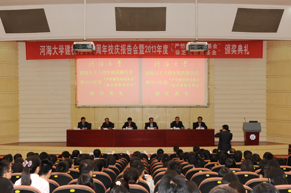 10月25日,我校举行河海大学建校九十八周年校庆报告会暨2013年度“严恺教育科技基金”和“徐芝纶教育基金”颁奖典礼。校党委书记朱拓、校长徐辉、副校长鞠平、党委副书记王济干、副校长唐洪武、党委副书记郭继超出席大会。大会由鞠平副校长主持。