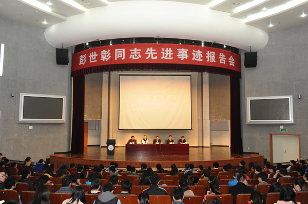 3月26日下午,我校举行了彭世彰同志先进事迹报告会。报告会由校长徐辉主持,500多名师生代表现场聆听了报告。