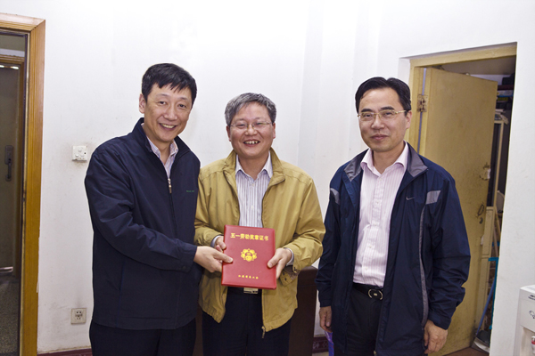 “五一”劳动节期间,校党委书记朱拓、副书记郭继超到水电院实验室看望了刚刚获得“江苏省五一劳动奖章”的顾冲时教授。