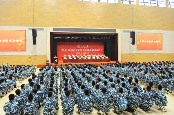 9月5日,我校隆重举行2014级本科生开学典礼暨军训动员大会。典礼嘉宾、河海大学杰出校友、黄河水利委员会信息中心主任娄渊清,南京舟桥旅副政委张念亮,政治部副主任彭峰应邀出席。我校党委书记朱拓,校长徐辉,副校长鞠平,副校长朱跃龙,副校长唐洪武,党委副书记郭继超,副校长王超,海军国防生选培办主任乔光玉大校,各学院及相关部门负责人参加了大会。