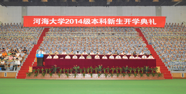 大会在庄严的国歌声中开始。徐辉校长发表了题为《心怀使命,绽放青春》的热情洋溢的讲话。徐校长代表全校师生向2014级新同学成功步入河海大学表示祝贺,并追溯了河海大学百年来治水报国和河海人献身时代的奋斗史,梳理了河海大学以及河海人肩负的特殊使命,希望广大新生力争成为“知识与能力兼备、智商与情商兼备、素质与作风兼备”的人,并做到:紧扣时代主题,以积极的心态回应社会的期待;找准人生坐标,在实践历练中实现人生价值;练就过硬本领,到最需要的地方去施展聪明才智;养成健全人 格,以健康向上的身心迎接未来挑战。