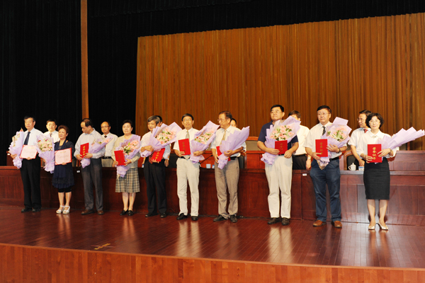 大会表彰了411名从教满三十年的在岗教职员工。国家、省教学名师,宝钢优秀教师特等奖获得者武清玺教授;江苏省教学名师朱昌平教授、长期从事数学学科科研与教学工作的陈才生教授;长期从事机电教学和科研以及管理工作的高新陵教授;水利规划专家唐德善教授;三赴非洲进行教育援助的祁林高级实验师;长期从事河口、海岸、环境学科科研与教学工作的王义刚教授;机器人足球世界冠军“e龙队”指导老师廖华丽教授;全国“巾帼建功”标兵荣誉称号获得者王慧敏教授;十多次获得省部级科技进步奖的郝振纯教授等十位优秀教师代表在主席台就座,并接受校领导颁发证书和学生献花。