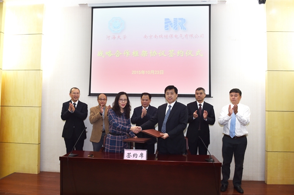 10月23日,河海大学与南瑞继保电气有限公司战略合作框架协议签字仪式在河海大学举行。南瑞继保电气有限公司总经理李九虎校友、河海大学校长徐辉、副校长鞠平、副校长陈星莺出席签字仪式。签字仪式由鞠平副校长主持。