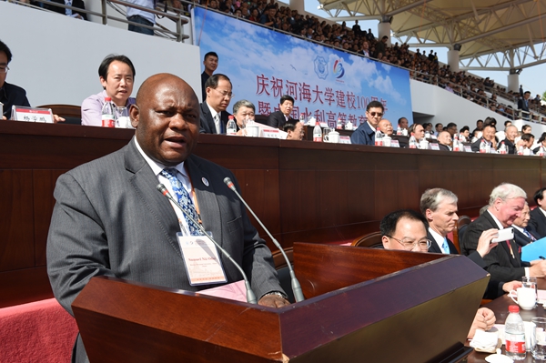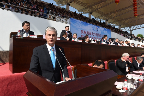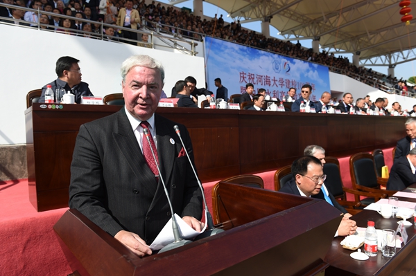 英国爵士、皇家工程院院士、英国伯明翰大学原校长迈克尔·斯特林、国际水利与环境工程及研究协会主席皮特·古德温分别代表国外高校和国际水利与环境工程及研究协会致辞。他们表示,河海大学在国际学术领域的崛起令人印象深刻,学术影响力日渐增长,在百年发展中,为全球水利电力事业健康快速发展作出了巨大贡献,在国际上享有极高声誉。期待河海大学在下一个百年取得更加辉煌的成绩。