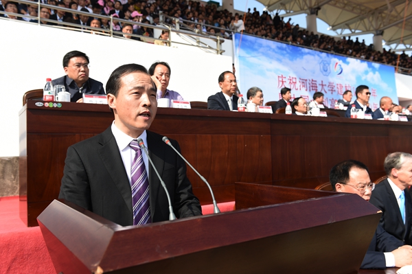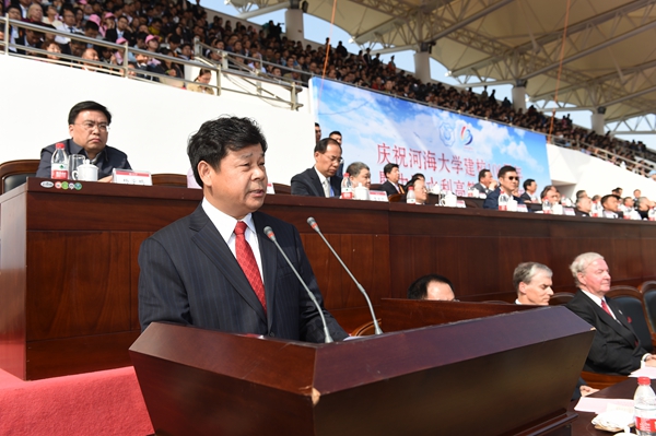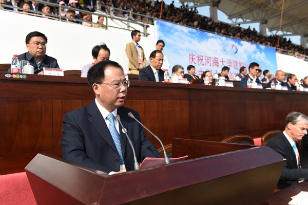 曹卫星副省长代表江苏省委省政府讲话。他表示,河海大学在为全国大局作贡献的同时,坚持立足江苏、根植江苏,紧紧围绕江苏经济社会发展重大需求,在水利、环境、交通、能源等领域积极开展综合服务和决策咨询,成为江苏人才培养的重要基地,科技创新的重要源头,社会服务的重要力量。江苏省委、省政府将一如既往地大力支持河海大学的建设,扎实做好与国家部省的共建工作,为学校改革发展创造良好条件。他希望河海大学进一步深化综合改革,创新人才培养体制、管理体制、办学体制,建立健全现代大学制度,不断激发内生动力和活力;进一步加强内涵建设,提高科学发展水平和人才培养质量,推进协同创新,增强学校综合实力和核心竞争力;进一步强化特色优势,集聚一批领军人物和创新团队,在水利、土木、资源和环境等若干领域争创一流;进一步密切校地合作,主动融入江苏教育现代和区域创新体系建设,为建设“强富美高”新江苏提供重要保障。