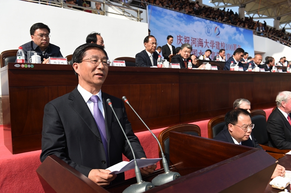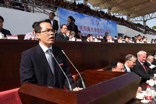周学文副部长代表水利部讲话。他指出,100年来河海大学始终以治水报国为己任,走出一条独具水利特色的发展之路,逐步成为国内办学规模最大、综合实力最强的水利高等学府,在我国水利发展史上书写了浓墨重彩的壮丽篇章,成为中国水利高等教育发展的集中缩影。他希望河海大学以建校100周年为契机,肩负起时代赋予的崇高使命和历史责任,以更大广阔的视野、更加奋发的精神、更加开放的姿态、更加执着的追求,坚持质量第一,突出水利特色,着力建成一流高等学府;弘扬育人传统,突出创新实践,着力培养高素质优秀人才;坚持需求导向,强化平台建设,着力实践创新驱动发展战略;汇聚各方英才,创新体制机制,着力打造高水平师资队伍;深化交流合作,推进开放办学,着力探索先进办学模式;坚持求真务实,培育优良学风,着力营造健康校园文化。水利部将一如既往地关心、重视和支持河海大学的建设与发展。