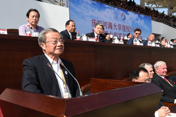 校党委书记朱拓在主持讲话中指出,百年校庆,既要回顾过去,更要开创未来、惠及学子。要办河海人心中的大学,创河海人心中的未来,承载起国家和民族对百年河海的重托。我们要崇尚真理,务实重行,精研学术,卓越发展,不断将河海先贤开创的伟业推向前进。站在新的历史起点,在各级党委和政府的亲切关怀下,在社会各界的支持指导下,我们将凝聚全体河海人的聪明才智,不断深化综合改革,破解学校发展难题,建设现代大学制度,推进治理体系与治理能力现代化,努力建设具有国际一流水利学科的高水平特色研究型大学。只要我们坚定发展方向,矢志不渝为之奋斗,河海大学一定能跨入世界同类大学的前列,“水利特色,世界一流”的美好愿景一定会实现。