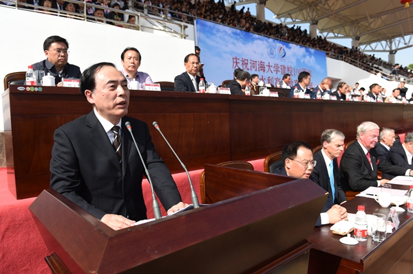 杜占元副部长代表教育部讲话。他指出,河海大学作为中国现代水利教育的先驱者和开拓者,成就了水利学科在全国的领先地位和卓越声望,发展成为水利高层次人才培养的摇篮和水利科技创新的重要基地,为促进水利事业的繁荣发展和国家富强、民族振兴做出了重要贡献。他希望河海大学在新的征程中,继续把自身发展融入到中国特色社会主义事业的伟大实践中,融入到国家治水兴水的历史洪流中,深入开展创新创业教育改革,培养造就大批具有社会责任感、创新精神和实践能力的一流人才;大力推进协同创新,紧密结合世界“一流大学”、“一流学科”建设,聚焦国家水安全面临的重大需求和水科学国际前沿,实现科技创新能力的新突破;努力提升社会服务水平,主动发挥知识密集,人才聚集的优势,为“一带一路”、长江经济带、海洋强国等国家重大战略以及区域经济社会发展提供坚强支撑。今后,教育部将一如既往地关心、重视和支持河海大学的建设与发展,推动河海大学事业发展迈上新的台阶。