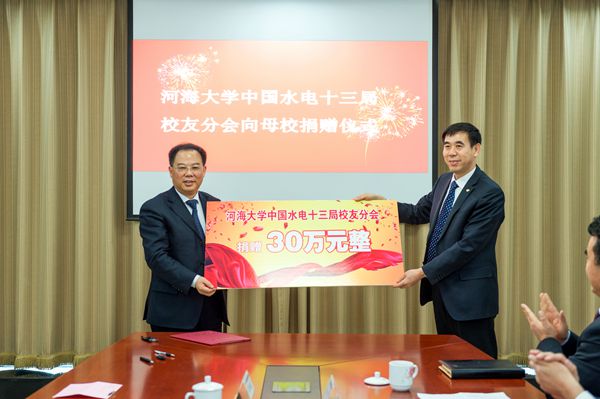 近日,中国水电十三局河海校友分会校友向我校教育发展基金会捐赠30万元,用于我校教育事业发展,捐赠仪式在中国水利水电第十三工程局有限公司举行。河海大学校长徐辉出席活动,中国水电十三局校友分会副会长张玉富副总经理兼国际公司总经理主持捐赠仪式。