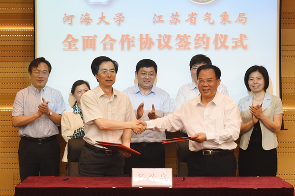 6月10日,河海大学与江苏省气象局签订全面合作协议。江苏省气象局党组书记、局长翟武全,副局长濮梅娟,副局长杨金彪,我校党委书记唐洪武,校长徐辉,副校长朱跃龙,党委副书记、纪委书记孟新,相关部门负责人及教师代表参加了签约仪式。签约仪式由唐洪武主持。