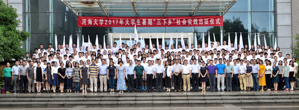 7月2日,河海大学举行2017年大学生暑期“三下乡”社会实践活动出征仪式。校党委副书记郭继超出席活动,并与有关部门负责人一道向社会实践重点团队、“河长制”宣讲调研专项团队授旗。