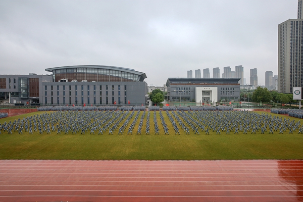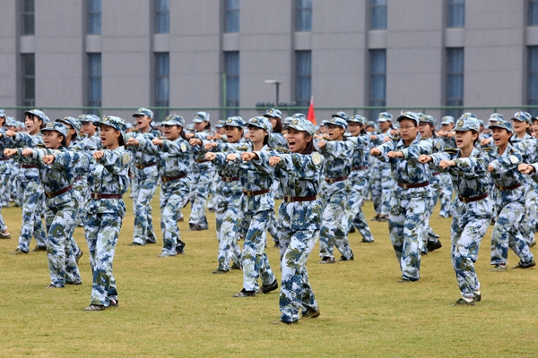 斗志昂扬的2017级新生喊着铿锵有力的口号,13个方队在雨中踏着整齐的步伐步入会场,接受全校师生的检阅,展现他们训练多日的成果。高昂的热情,标准的动作,飒爽的英姿,充分体现了同学们拼搏奋进的意志,健康向上的精神。精彩的表现赢得了在场领导、嘉宾、承训部队官兵和师生的一致好评。分列式结束后,同学们仍然坚持在雨中进行了男生军体拳、女生军体拳、女生防身术和男生匕首操汇报表演。