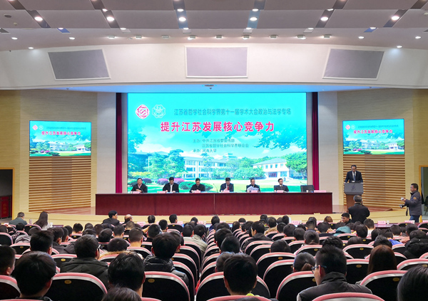 大会聚焦“法治社会建设”和“社会治理创新”,设法学、政治学两个分会场进行了研讨。南京大学法学院副院长宋晓教授就《完善涉外争议解决机制对于提升江苏发展核心竞争力的意义》问题,南京师范大学法学院院长蔡道通教授就《法学研究如何贡献思想与对策支持江苏发展核心竞争力的提升》问题,东南大学法学院龚向和教授就《新时代的社会权与经济发展》问题,中共江苏省委党校政法部副主任梁三利教授就《让法治成为江苏发展核心竞争力的重要标志》问题,河海大学公共管理学院政治学研究所所长许佳君教授就《工程移民政治学》问题,作了学术交流发言。