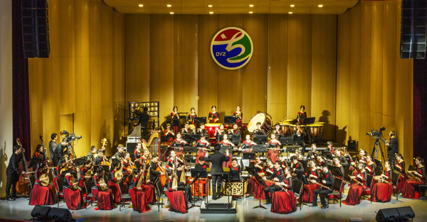 《古槐寻根》是著名作曲家赵季平创作的经典大型民族管弦乐作品,意境深远、旋律优美、层层递进,淋漓尽致地表达了国人的眷恋故土、饮水思源的情怀,具有浓郁的当代民族文化气质和中国气派。我校民族乐团在常任指挥、一级作曲、江苏民族乐团团长王爱康先生指导下,历时两年多,排练了这部作品,并在校内外多次演出。作为江苏省选送的唯一民乐作品,民乐合奏《古槐寻根》经过竞争激烈的专家评审最终入围现场艺术展演,并以精彩的演出征服了观众和评委。在展演活动期间举行的专题座谈会上,中国音协管乐学会主席、解放军军乐团音乐总监于海代表专家观察团专门点评并表扬了我校民族乐团的表演水平和精神风貌。