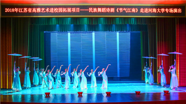 开幕式上,由南京市文学艺术联合会、江苏演艺文化传播有限公司、南京艺术学院舞蹈学院共同创作的民族舞蹈诗剧《节气江南》进行了展演。该剧是江苏省2018高雅艺术进校园拓展项目,作品以二十四节气为背景,着墨江南,运用诸多非遗元素,从日晷、望雨、听风、追月、喜雪五个篇章编织出独具魅力的风俗人情画卷,揭示了四季轮回、生命返青、顺天应时和天人合一的中华哲学。演出美轮美奂、精彩纷呈,为我校师生深入了解中华优秀传统文化、体悟民族精神、培养爱国情感提供了一部生动教材,反响热烈。