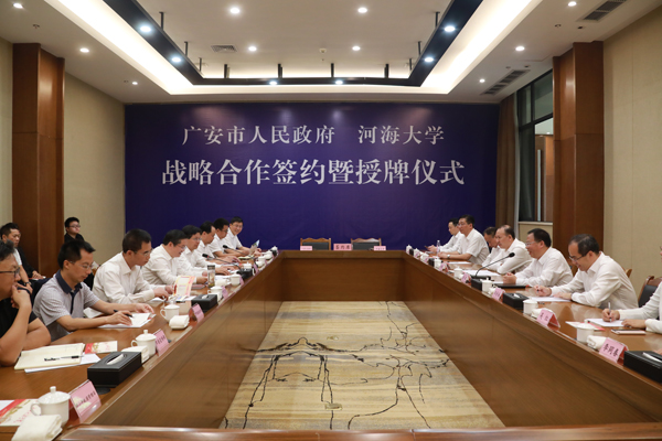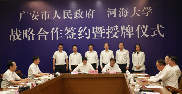 9月29日,河海大学、广安市人民政府战略合作签约暨授牌仪式在广安市举行。河海大学校长徐辉,广安市市委副书记、市长曾卿代表双方签署协议并讲话。河海大学副校长郑金海,广安市副市长尹黎明等出席签约仪式。签约仪式由广安市市委常委、副市长李继刚主持。