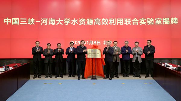 1月8日,中国三峡——河海大学水资源高效利用联合实验室揭牌仪式在北京举行。这是两家单位进一步深化合作,认真贯彻落实习近平总书记推动长江经济带发展重要战略思想、打造长江大保护核心科技平台的重大举措。中国长江三峡集团(以下简称“三峡集团”)党组书记、董事长雷鸣山,党组成员、副总经理王良友,总工程师张曙光,中国工程院院士、长江保护与绿色发展研究院院长张建云,河海大学党委书记唐洪武、校长徐辉、副校长郑金海,长江保护与绿色发展研究院副院长、南京水利科学研究院副院长李云等出席揭牌仪式并参加座谈,座谈会由雷鸣山董事长主持。