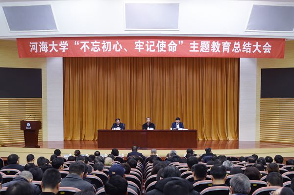 1月11日,河海大学召开“不忘初心、牢记使命”主题教育总结大会,贯彻落实习近平总书记在“不忘初心、牢记使命”主题教育总结大会上的重要讲话精神,贯彻落实教育部直属高校主题教育总结大会精神,全面总结学校开展“不忘初心、牢记使命”主题教育的主要做法和工作成效,安排部署进一步巩固和深化主题教育成果相关工作。教育部直属高校“不忘初心、牢记使命”主题教育第七巡回指导组组长李廉出席会议并讲话,校党委书记唐洪武作总结报告,校长徐辉主持会议。第七巡回指导组成员赵丽娜、王琦到会指导,校领导、党委委员、纪委委员、全体中层干部、以及教授党员代表、教职工党员代表和学生党员代表参加大会。