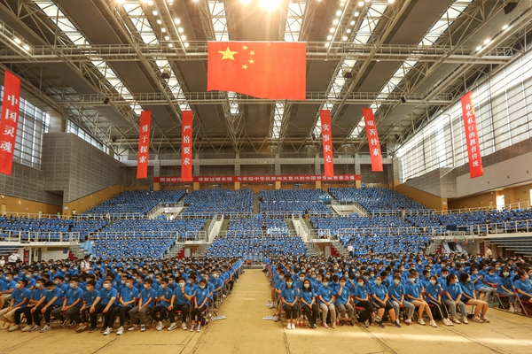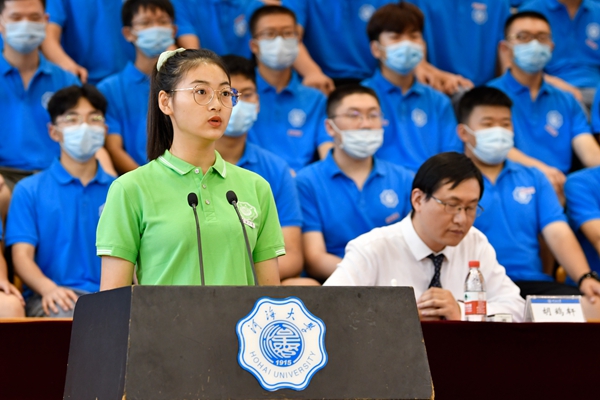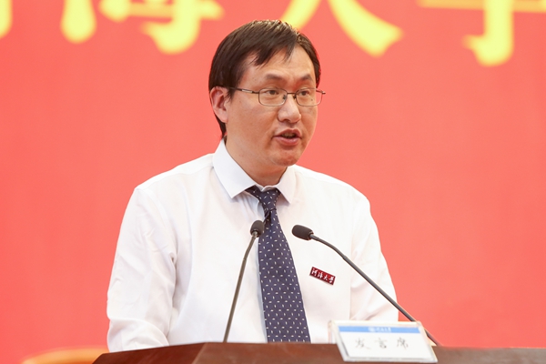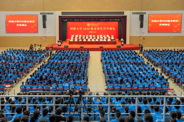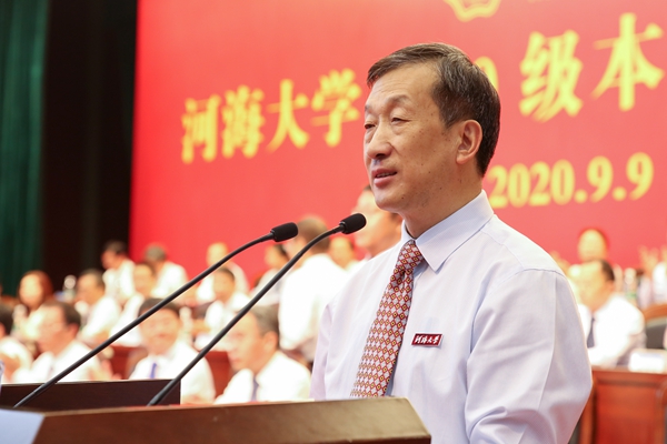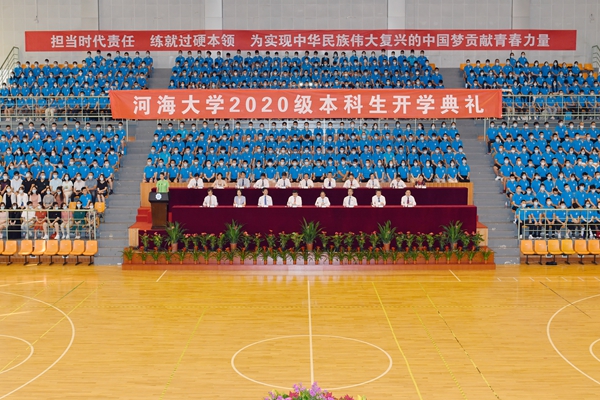 大会在庄严的国歌声中开始。徐辉校长首先发表题为《激扬青春力量,勇担时代使命》的讲话。徐辉校长代表全校师生向2020级新同学的到来表示最热烈的欢迎。他说,2020年是极不平凡的一年,突如其来的疫情给全世界带来了严重危机,也打乱了同学们正常的高考冲刺节奏。同学们在感动中奋进、在重压中成钢,经受住了这份特殊的人生考验,由衷地为你们点赞!他指出,河海大学“缘水而生、因水而为、顺水而长”,始终与国家同命运,与时代共发展。百年薪火传承,河海人从来不曾忘记时代赋予的使命,成为不同历史时期的生力军。广大新生作为河海的新主人,是百年河海源远流长之“本”,河海的特质要靠你们来传承和弘扬,河海的未来更要靠你们去书写和创造。徐辉校长对广大新生提出三点希望和要求:一是要坚定理想信念,厚植爱国情怀。青年人只有将个人理想与奋斗目标同国家的命运紧密结合在一起,厚植爱国情怀,才能汲取到源源不断的力量,希望同学们要筑牢思想根基,弘扬爱国爱水优良传统,矢志不渝朝着崇高理想奋进,用一生的拼搏来践行跟党走的理想追求。二是要锤炼意志品行,勇于砥砺奋斗。品德修养是立身之基,坚韧意志是成功的关键,希望同学们要勇于开拓创新,把奋斗作为青春最亮丽的底色,培养持续学习、终身学习的能力,为人生远航打下坚实的基础。三是要提升综合素质,练就过硬本领。德智体美劳全面发展是学校一以贯之的人才培养理念,希望同学们在练就“扎实的专业基础、过硬的实践本领、优良的综合素质、突出的研究能力”上下功夫,做到“知识与能力兼备,智商与情商兼备,素质与作风兼备”,成为新时代具有“中国灵魂、全球视野、河海特质”的卓越人才。