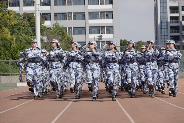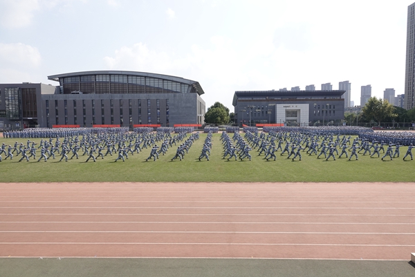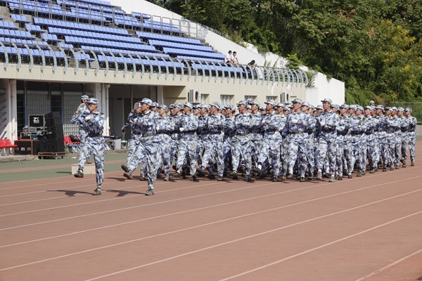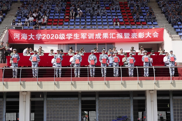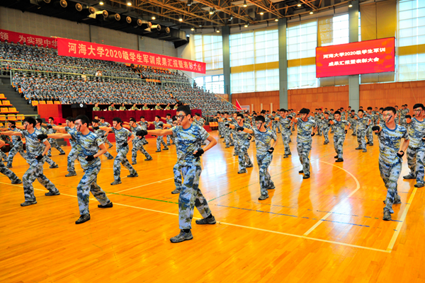 入场式中,由1600名新生组成的方队通过队形变化,拼出“中国”“八一”“河海”“水滴”“105”等字样图案,同学们齐声高喊“共抗疫情,爱国力行,弘扬伟大抗疫精神”“厉行节约,反对浪费”“艰苦朴素、实事求是、严格要求、勇于探索”等口号,用青春向祖国告白,用行动诠释担当。在分列式中,由2020级学生军训旅十个连队组成的16个方队,喊着铿锵有力的口号,踏着整齐的步伐走向检阅台,展现多日训练的成果,接受全校师生的检阅。饱满的热情,嘹亮的口号,铿锵的步伐,飒爽的英姿,充分体现了同学们朝气蓬勃的青春活力和奋发向上的精神风貌。分列式后一连至十连组成了男生擒敌拳和女生搏击术汇报表演,十一连至十三连进行了队列操、警棍盾牌操、格斗术、匕首操汇报表演。同学们精彩的表现赢得了现场领导、嘉宾、承训部队官兵以及师生的一致好评。