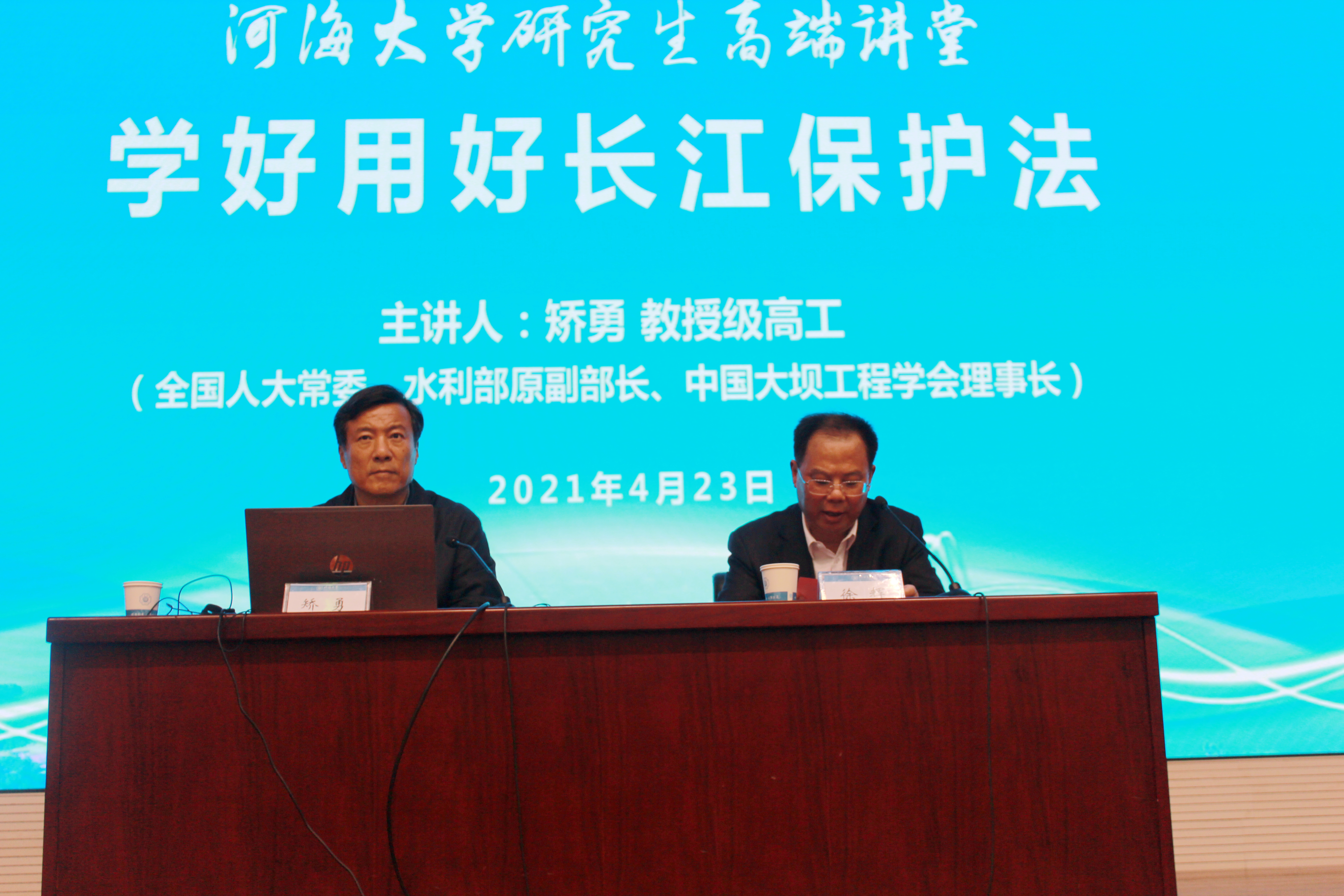 4月23日,第十三届全国人大常委矫勇教授受邀河海大学研究生高端讲堂为我校师生作题为“学好用好长江保护法”的学术报告,徐辉校长主持报告会。