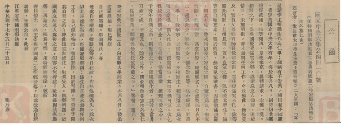 请求释放齐国庆等同学的公函