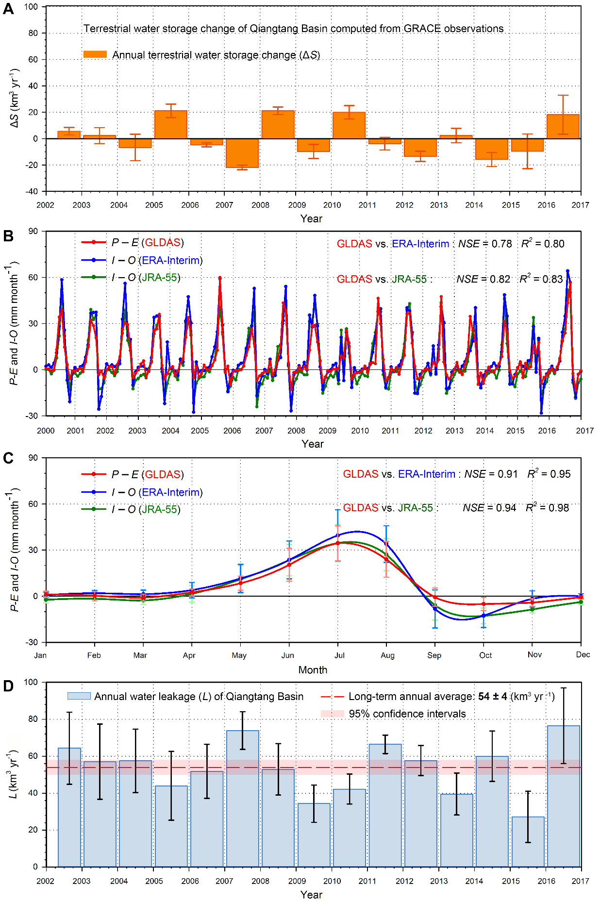 研究团队综合利用新一代的全球陆面同化系统、全球大气再分析资料、多源遥感反演、重力卫星等数据,对青藏高原羌塘流域的水量平衡过程进行了集合模拟,对关键水文变量进行了多模式交叉检验和地面观测验证(图2)。研究发现:作为青藏高原最大的内流区,进出羌塘流域的大气水汽量并不平衡,进入的水汽量明显要多,而多出来的水并未存贮在流域内;羌塘盆地存在严重的水量不平衡现象,每年丢失的水量为54 ± 4 km3(约540亿方),而且丢失的水量主要分布在羌塘南部的裂谷集中地区。