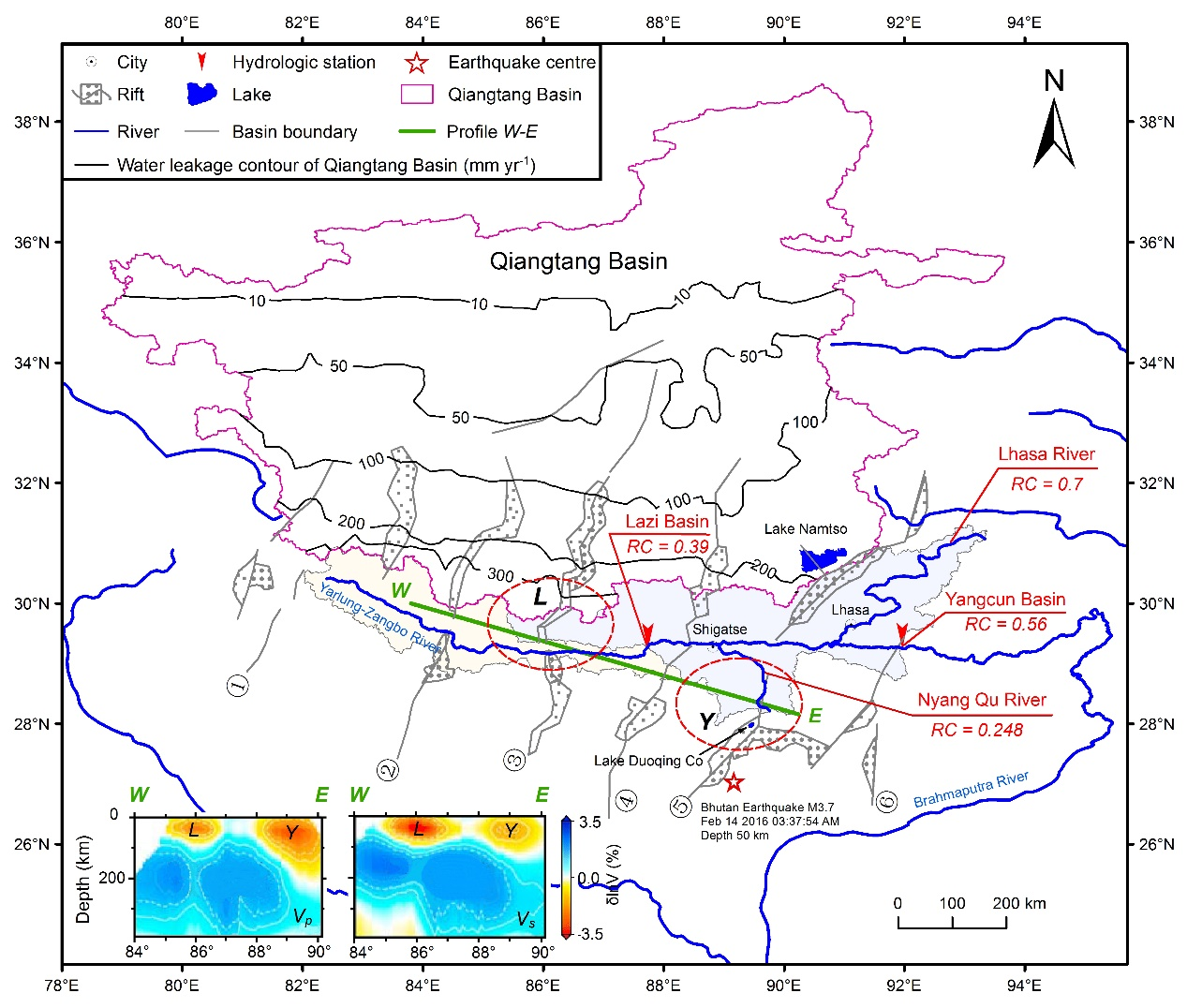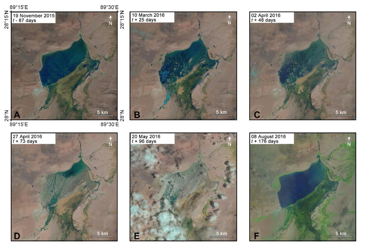 研究人员通过横跨羌塘南部裂谷群的上地幔地震波数据,进一步揭示出该裂谷群存在特殊的低速带,且从地表扩展到地下深部,这暗示着大量矿物水很可能存在于裂谷下的低速带中(图3)。该研究还发现,这一地区与裂谷交叉的河流,径流系数偏低,存在河水渗漏现象,而与裂谷平行的河流完全正常(图3)。另外,2016年2月14日,亚东谷露裂谷附近发生了M3.7级地震,研究人员通过多时相可见光遥感反演发现:地震后,位于该裂谷上的多庆错湖(40 km2)的水位快速下降,地震后96天完全消失,这表明裂谷的张性断裂具有导水特性(图4)。遥感反演与地质解译表明:羌塘盆地南部近N-S向裂谷群(20公里宽,300公里长)的深正断层和张性断裂很可能是跨流域地下水的重要传输通道。