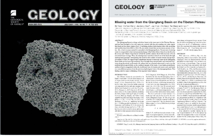 在国家自然科学基金西南河流源区重大研究计划集成项目(项目编号:92047301)资助下,我校多名学者在青藏高原大尺度流域水量平衡方面开展了多学科交叉研究,标志性论文成果“Missing water from the Qiangtang Basin on the Tibetan Plateau”于今年7月发表在《Geology》杂志(图1)。河海大学水文水资源学院雍斌教授为论文第一作者,河海大学地球科学与工程学院陈建生教授、西湖大学工学院李凌教授为共同通讯作者,美国加州大学伯克利分校地质学家王其允教授为第二作者,河海大学计算机与信息学院陈嘉琪教授、瑞士联邦理工大学D. A. Barry教授、河海大学水利水电学院王涛副研究员为合作作者。