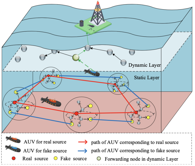 在应对外部被动监听攻击方面,韩光洁团队也开展了面向水声传感网的源位置隐私安全研究。针对海底输油管道面临的安全问题,韩光洁团队提出一种基于伪装AUV的源位置隐私保护方案,通过交换数据源和AUV的身份来形成匿名簇以混淆虚假源与真实源,达到对真实数据源位置的保护。此外,设计了一种数据分片方法,以缓解因虚假数据包传输而导致的能耗上升问题。