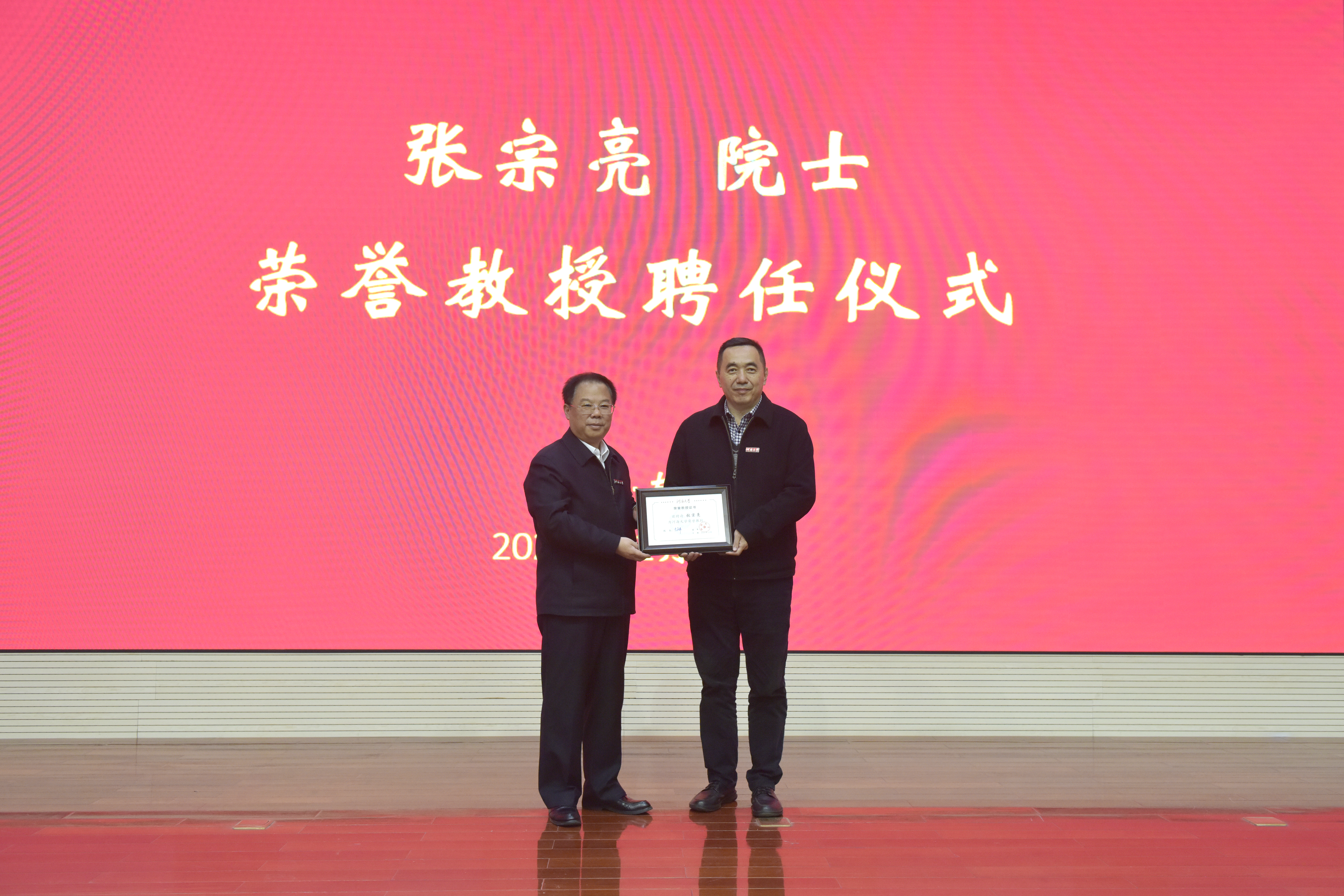 聘任仪式上,校长徐辉为张宗亮院士颁发荣誉教授证书并佩戴校徽。