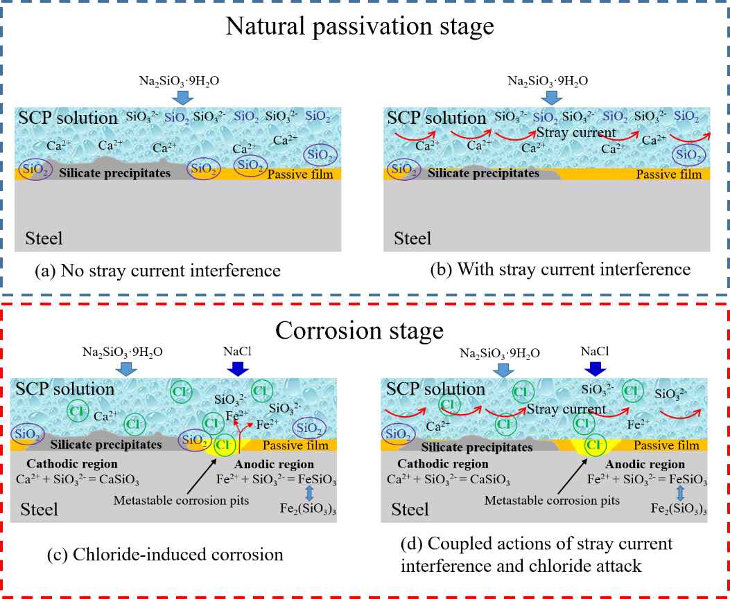 该工作是团队近期关于先进建设工程材料耐久性相关研究的最新进展之一。近年来,团队对先进建设工程材料的制备、性能调控、耐久性机理及预测模型进行了系列探索。针对电气化轨道交通系统存在的耐久性问题,开展了杂散电流和阻锈剂对高强预应力钢筋电化学行为的影响研究,明确了杂散电流的劣化效应,得到硅酸钠是一种能有效缓解杂散电流引起的钢筋锈蚀极具潜力的阻锈剂,论文研究为降低杂散电流的腐蚀风险提供了新途径,研究成果以题为“Effects of stray current and silicate ions on electrochemical behavior of a high-strength prestressing steel in simulated concrete pore solutions”发表在国际腐蚀顶刊《Corrosion Science》上。