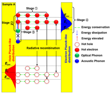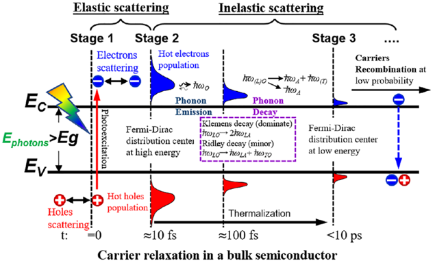 热载流子光伏电池(Hot carrier solar cells)是目前较有发展前景的第三代太阳能光伏电池之一,该薄膜电池具有结构简单、工艺简化、成本较低、理论效率更高等优势。与传统的单P-N结光伏电池相比,热载流子光伏电池通过充分利用载流子热弛豫能量(Thermalization energy)来显著提高电池的能量转换效率,从而有望突破传统Shockley-Queisser电池效率极限。标准条件下,单结硅基光伏电池效率极限约为30%左右,而热载流子光伏电池理论效率将达到65%左右。为及时捕捉并充分利用载流子热弛豫能量,该型电池吸收层需将载流子弛豫过程从飞秒级(10-12秒)时间尺度有效减缓至纳秒级(10-9秒)时间尺度。经多年研究,学界已指出声子瓶颈效应(Phonon bottleneck effect)在有效降低载流子热弛豫速率方面起着关键作用。但该效应机理尚不明晰,相关结论也不一致。因此,阐述声子瓶颈效应机理,并将其应用于热载流子光伏电池的研制就显得及其必要和迫切。