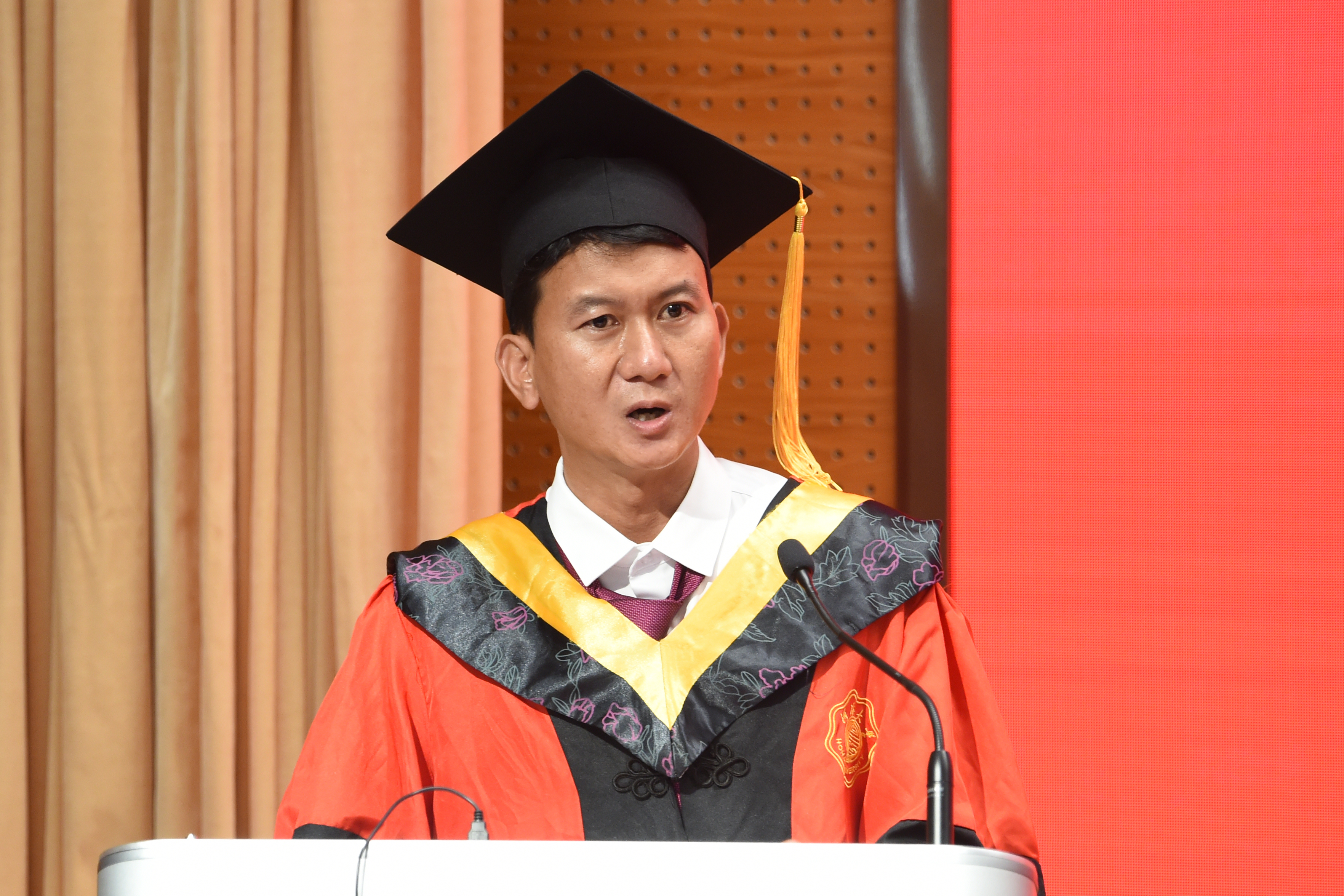 典礼嘉宾、2011届高等学历继续教育水利水电工程专业本科班杰出校友冯自祥董事长向毕业生们表示最诚挚的祝贺,向母校和老师们致以最崇高的敬意。他与毕业生们分享了自己在河海的求学经历和创立云南民鼎集团有限公司的工作经历,勉励同学们踏浪而行,做一朵江河湖海奔涌的浪花,向着广阔无垠的星辰大海扬帆远航。