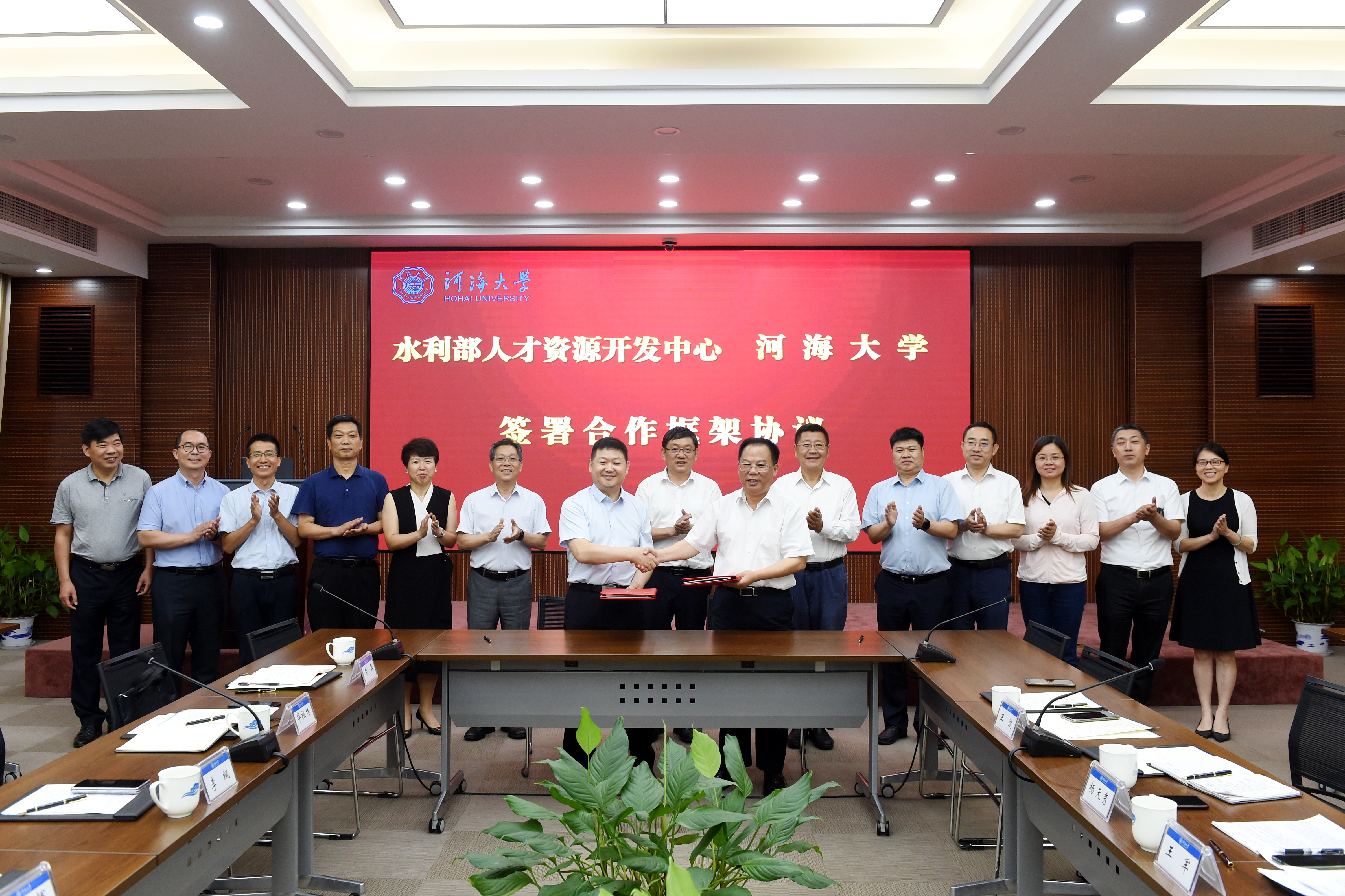 7月26日,河海大学与水利部人才资源开发中心合作签约仪式在我校举行。河海大学校长徐辉和水利部人才资源开发中心主任王新跃代表双方签署合作协议。河海大学党委书记唐洪武、副校长徐卫亚,水利部人才资源开发中心副主任孙学勇出席签约仪式。