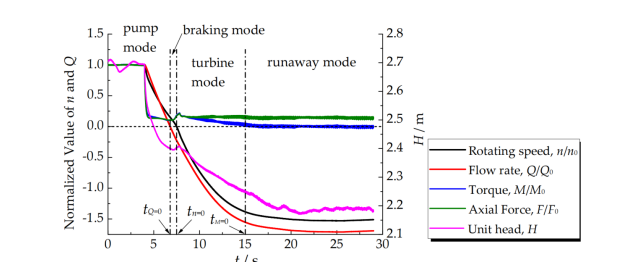 图2 水泵装置断电飞逸过渡过程外特性变化规律