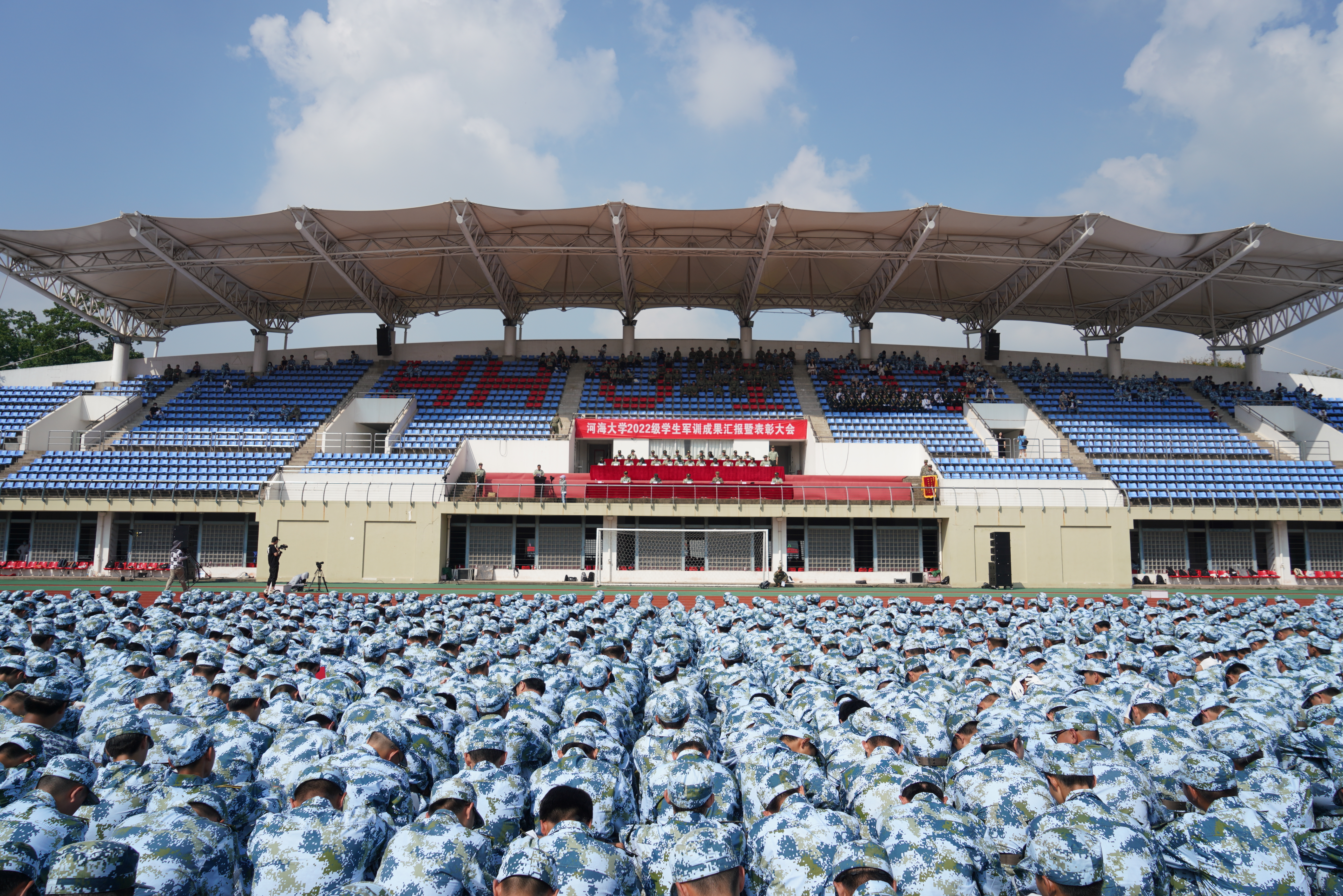 9月17日,我校举行2022级学生军训成果汇报暨表彰大会。校长徐辉,2022级学生军训旅政委、校党委副书记郭继超,2022级学生军训旅旅长、副校长董增川,承训部队领导和嘉宾出席大会。