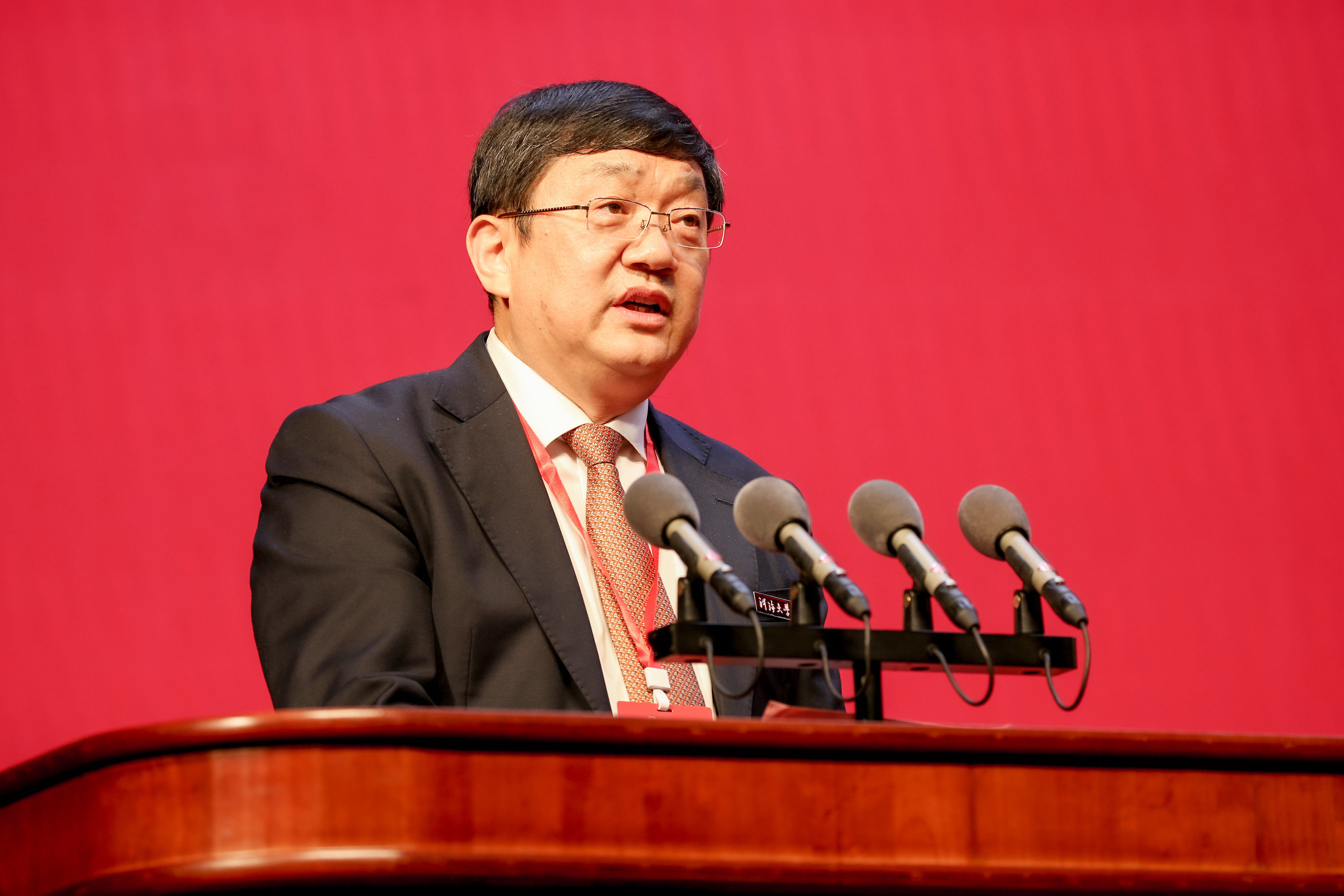 河海大学校长徐辉代表学校作了题为《守正创新担使命 踔厉奋发启新程》的讲话。他表示,河海大学“因水而生、缘水而为、顺水而长”,在国家危难之际诞生,在新中国开启华章,在改革开放后快速发展,在新时代走向繁荣,始终传承爱国爱水红色基因,在治水救国、治水报国、治水强国的伟大征程中书写了“大哉河海奔前程,毋负邦人期”的壮丽诗篇。立足新时代、踏上新征程,河海大学将牢记“国之大者”,坚持为党育人、为国育才,高站位把牢办学政治方向,超常规培养急需创新人才,聚合力支撑高水平科技自立自强,高质量回应行业发展需求,高水平扩大教育对外开放,奋力开创新时期水利高等教育新局面,在保障国家水安全、引领世界水科技、参与全球水治理的新的伟大实践中踔厉奋发、勇毅前行,为服务国家“江河战略”,推动新阶段水利高质量发展,以水安全保障中华民族永续发展贡献河海智慧与力量。