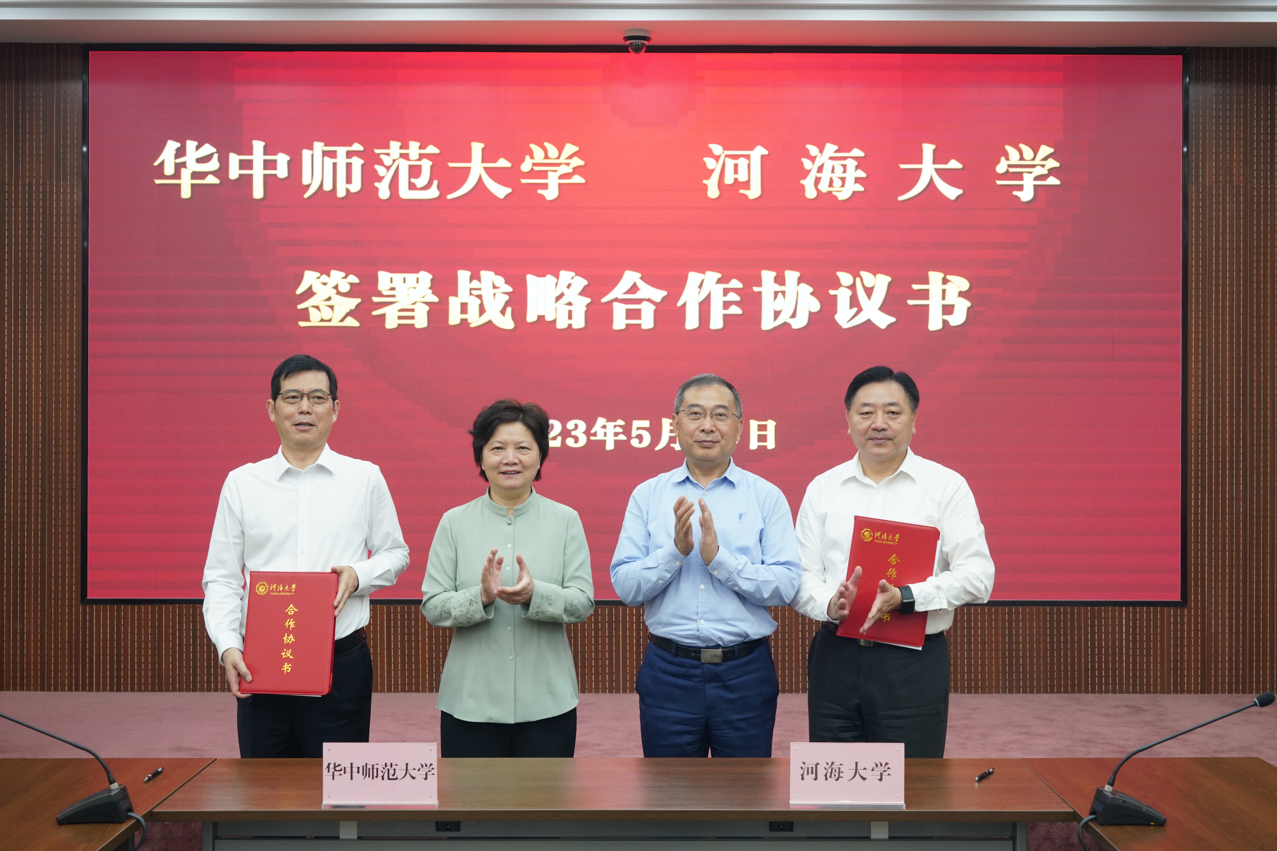 陈迪明和陆国宾分别代表双方签署《华中师范大学 河海大学战略合作协议书》。