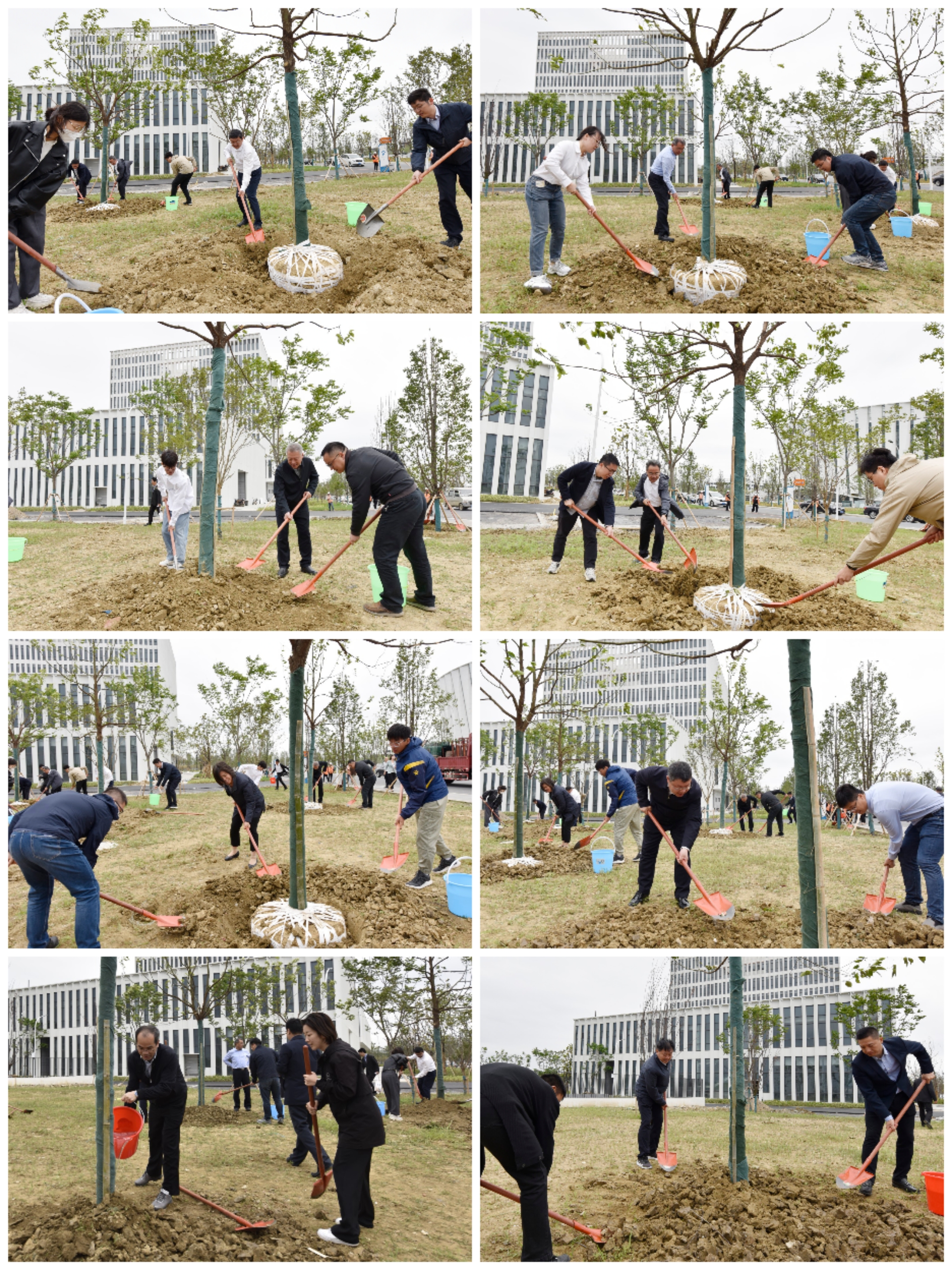 植树现场,全体校领导与师生代表齐心协力铲土造坑、培土围堰、提水浇灌,用实际行动参与新校区建设。经过师生们共同精心栽植,一株株小树错落有致,为充满现代化气息的校园又增添了一片新绿。